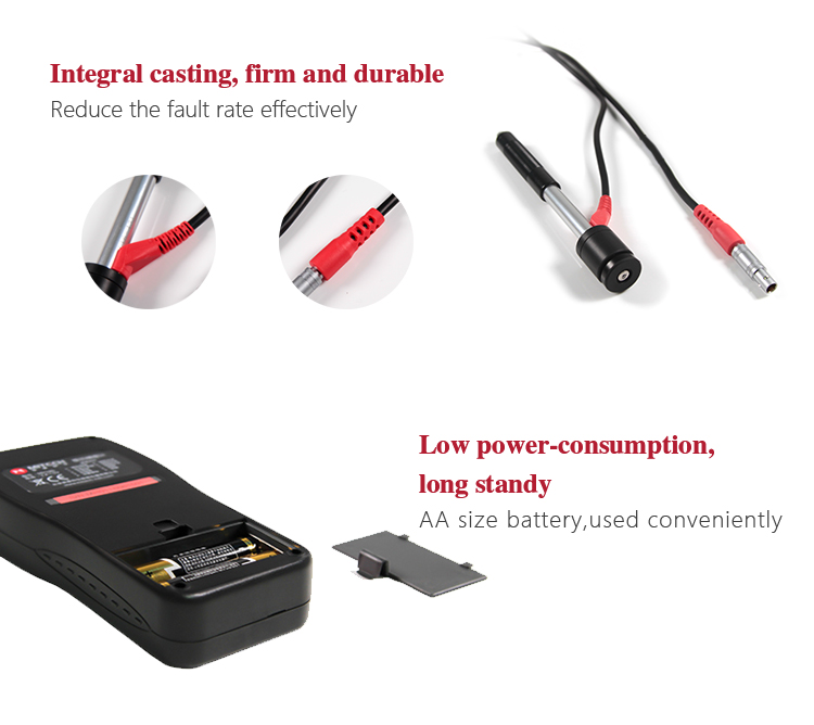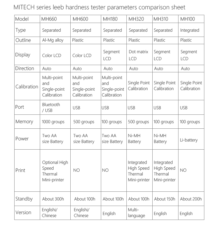 Mitech portable Leeb hardness testers,with low-power consumption design and long standby, MH180/MH200/MH600/MH660 all adopt two AA size alkaline batteries for power supply.