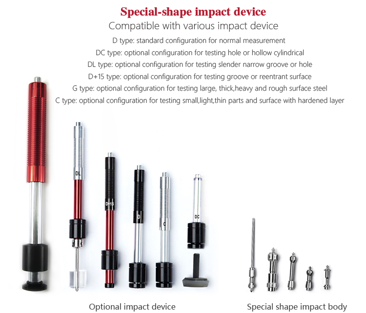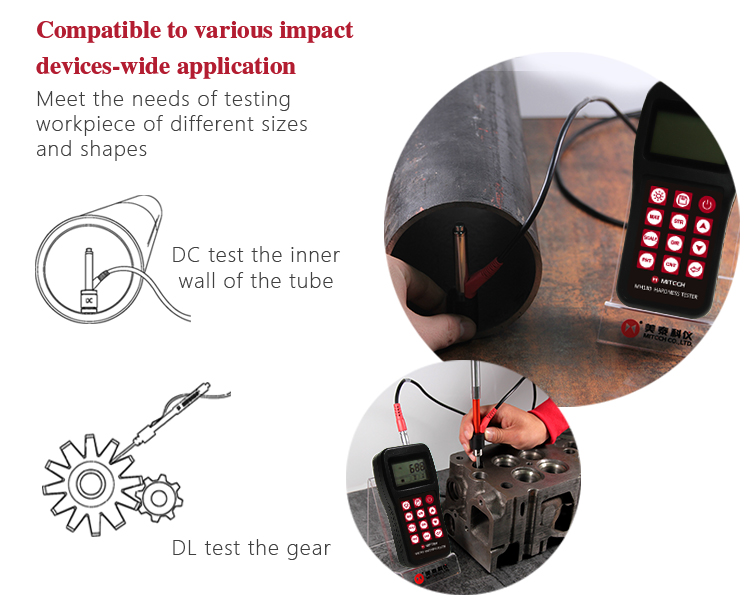 The DL type impact device of Mitech portable hardness tester, height 204mm, weight 50g, diameter 20mm, has build-in DL impact body, front side is slim device, it is suitable for hardness measurement of the narrow parts (like holes, slits) of the workpiece with weight above 5kg, thickness above 5mm. It is widely used for the narrow part of the installed machinery or permanently assembled parts, rapidly testing for multiple measuring parts in large range of the large-scale workpiece, hardness testing for gear tooth root and other slender narrow grooves or hole. It can realize the precise measurements for Leeb, Brinell, Rockwell and others.