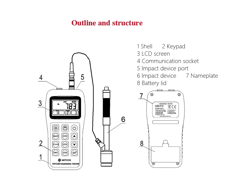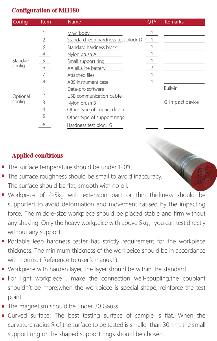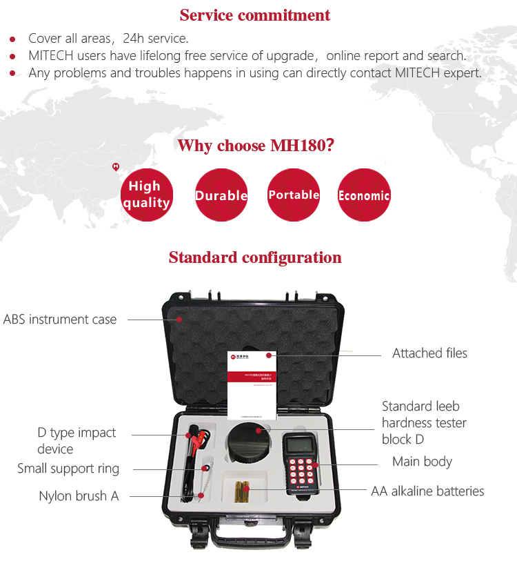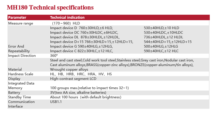 MH180 portable Leeb hardness tester, based on Leeb hardness measuring principle, quick and easy,on-site test the hardness of series metal materials, support free conversion between Leeb, Brinell, Rockwell hardness scale and others,It uses high-contrast  segment LCD to display , small size, light,portable, stable and reliable performance.It is widely used in failure analysis of metal processing and manufacturing, special equipment, permanent assembly, inspection and other fields.It can meet the regular hardness testing of industrial production , quality and cheap, which is the first choice for practical and economical models.