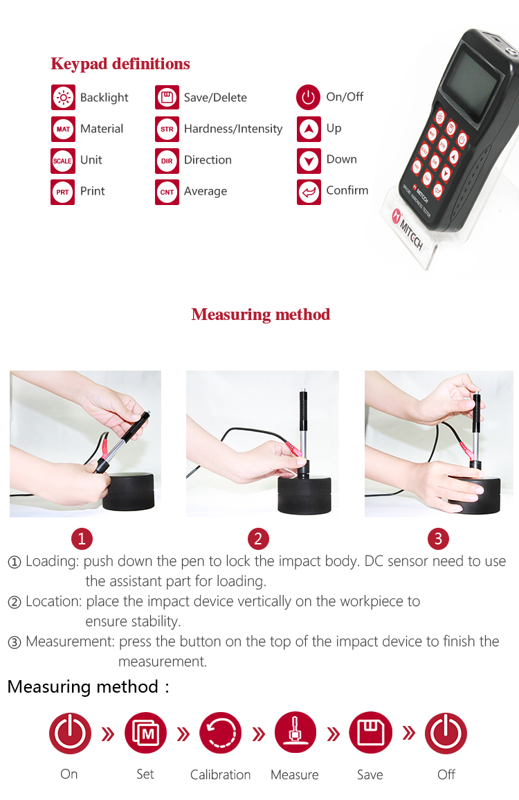 The DC type impact device of Mitech portable hardness tester,height: 86mm, weight: 50g,diameter: 20mm, has build-in DC impact body. The load device of the impact body is designed at the outside of the impact device. With small volume, DC type impact device is suitable for hardness measurement of the marrow parts (like holes, slits) of the workpiece with weight above 5kg, thickness above 5mm. It is widely used for the narrow parts of the installed machinery or permanently assembled parts, rapidly testing for multiple measuring parts in large range of the large-scale workpiece, hardness testing for gear tooth root and other slender narrow grooves or hole. It can realize the precise measurements for Leeb, Brinell, Rockwell and others.