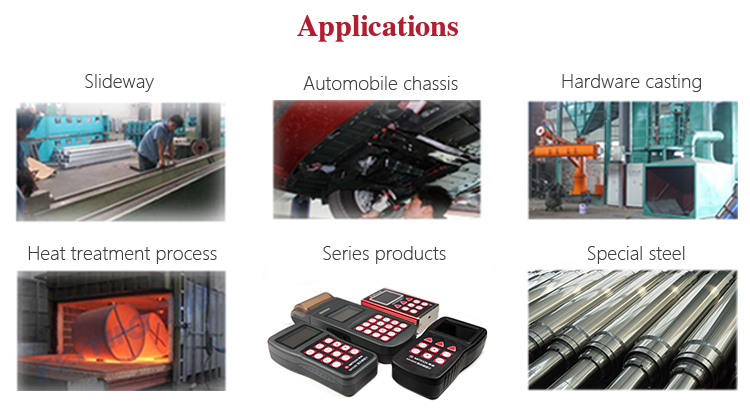 Main applications:car chassis hardness testing;the installed machinery and permanently assembled parts;rapid testing in large range and multi-measuring areas for large-scale work piece;failure analysis of pressure vessel, steam generator and other equipment;bearings and other parts;material identification in the warehouse of metallic materials;heat treatment workpiece of quality control;