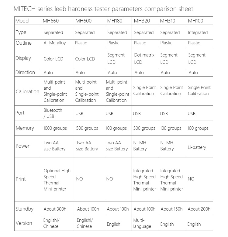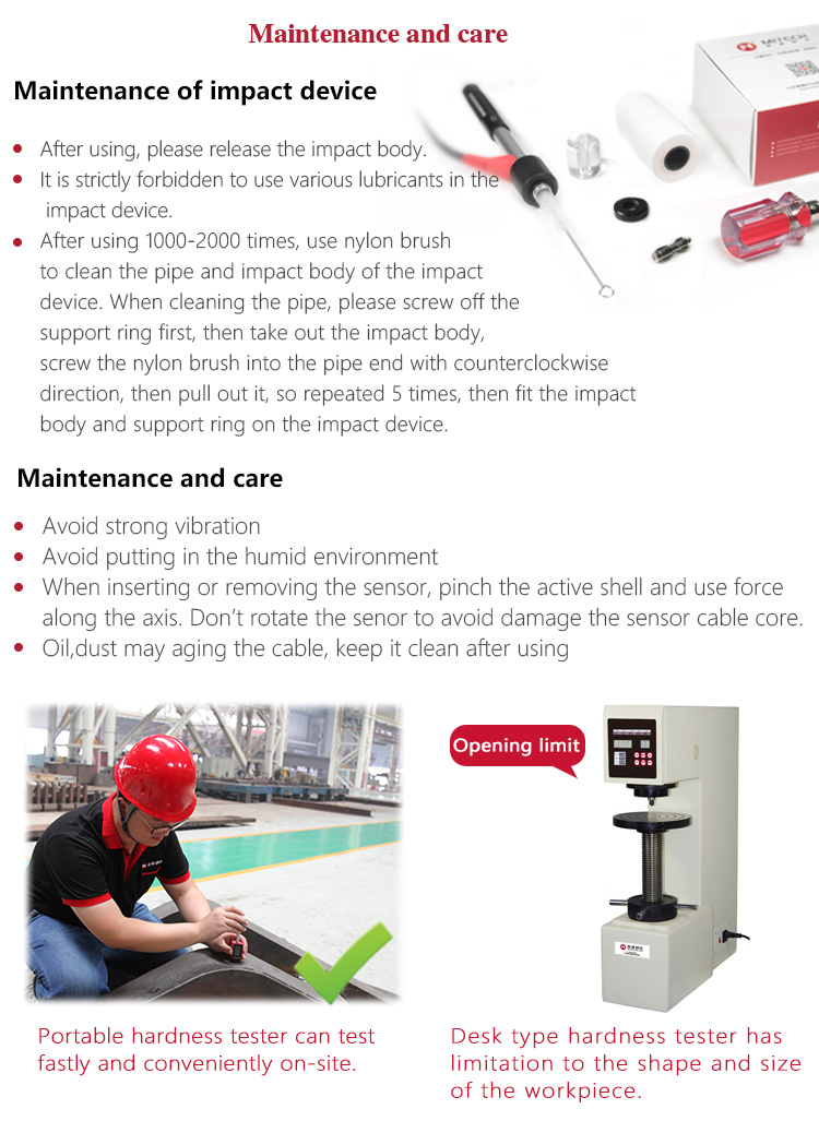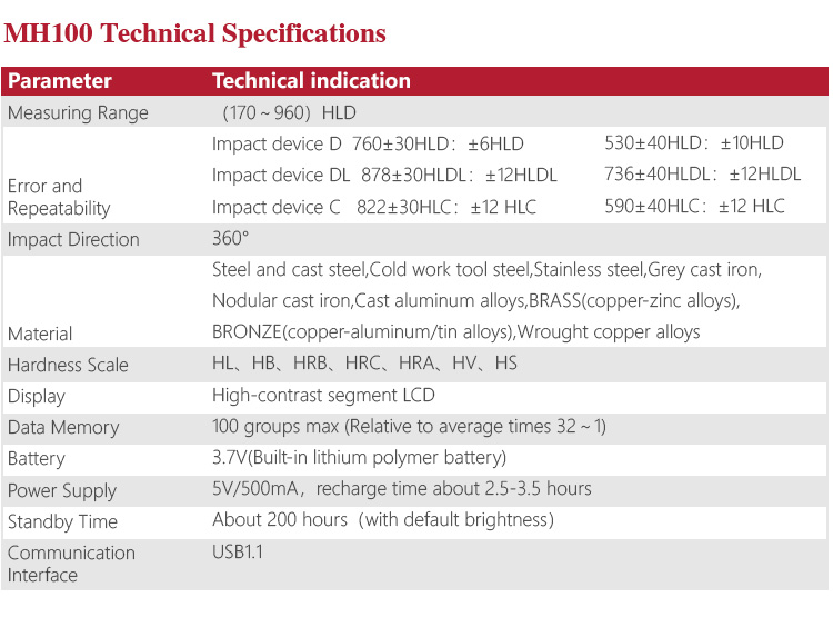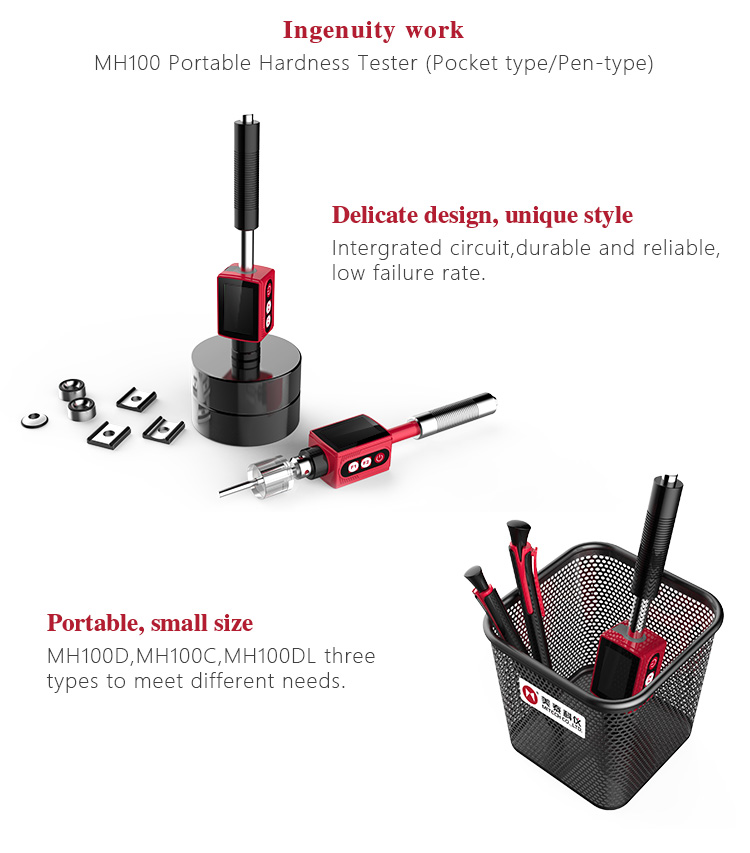 Product OverviewMH100 series pocket hardness meters, also known as pen-type hardness tester, based on Leeb hardness measuring principle, quick and easy on-site test the hardness of series metal materials, support free conversion between Richter, Brinell, Rockwell hardness scale and others,integrated compact design, small size, portable, highly integrated, stable and reliable performance, supporting data transfer and print the stored function. Widely used in failure analysis of metal processing and manufacturing, special equipment, permanent assembly, inspection and other fields. Particularly suitable for large parts and non-removable part of the site hardness testing. It is professional precision instrument to improve the pass rate of production and cost savings .