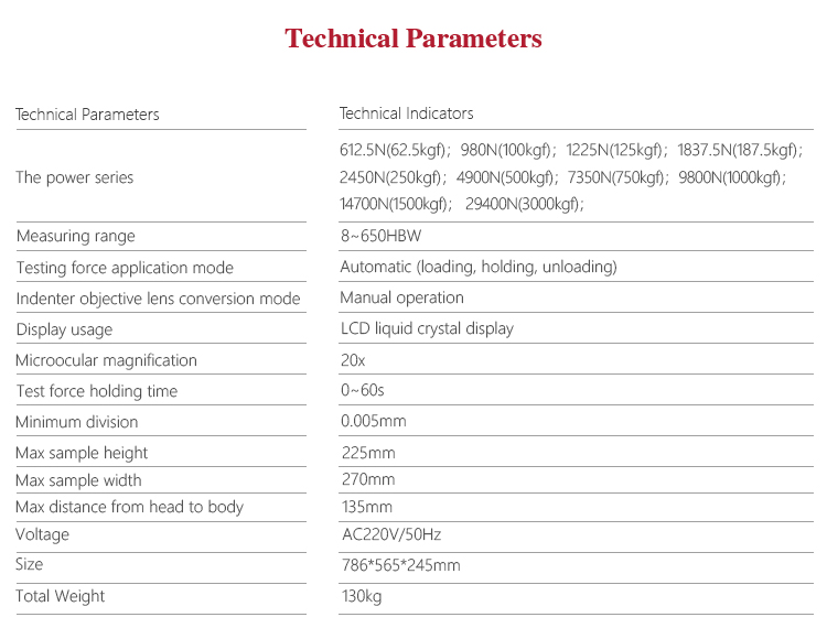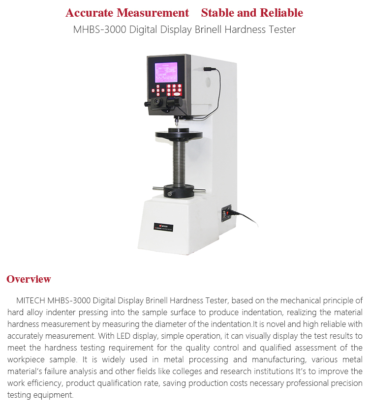 MITECH MHBS-3000 Digital Display Brinell Hardness Tester, based on the mechanical principle of hard alloy indenter pressing into the sample surface to produce indentation, realizing the material hardness measurement by measuring the diameter of the indentation.It is novel and high reliable with accurately measurement. With LED display, simple operation, it can visually display the test results to meet the hardness testing requirement for the quality control and qualified assessment of the workpiece sample. It is widely used in metal processing and manufacturing, various metal material’s failure analysis and other fields like colleges and research institutions It’s to improve the work efficiency, product qualification rate, saving production costs necessary professional precision testing equipment.