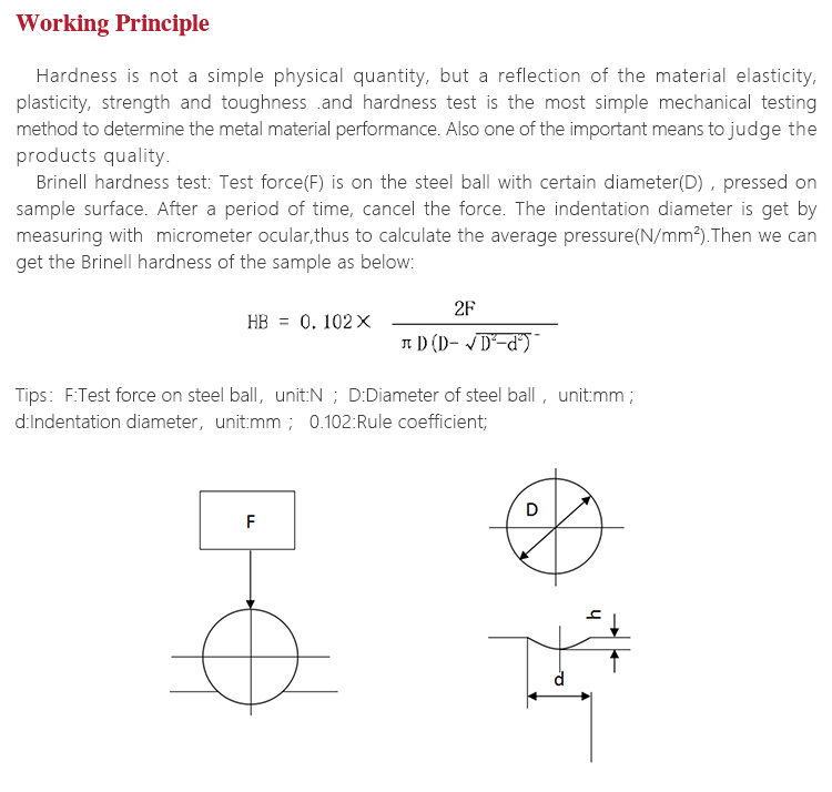 Brinell hardness test: Test force(F) is on the steel ball with certain diameter(D) , pressed on sample surface. After a period of time, cancel the force. The indentation diameter is get by measuring with micrometer ocular,thus to calculate the average pressure(N/mm2).