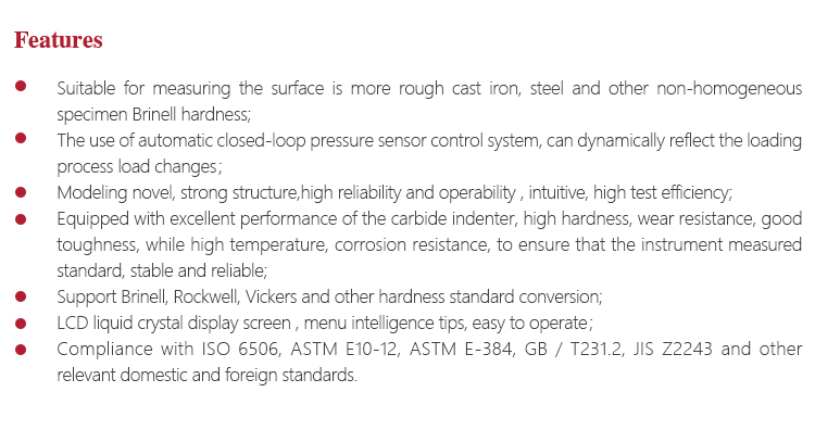 l Compliance with ISO 6506, ASTM E10-12, ASTM E-384, GB / T231.2, JIS Z2243 and other relevant domestic and foreign