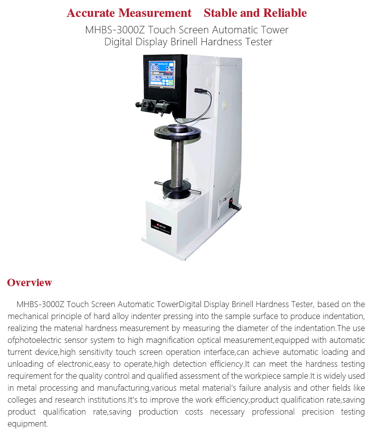 Mitech MHBS-3000Z Touch Screen Automatic Tower Digital Display Brinell Hardness Tester, based on the mechanical principle of hard alloy indenter pressing into the sample surface to produce indentation, realizing the material hardness measurement by measuring the diameter of the indentation, The use of photoelectric sensor system to high magnification optical measurement, equipped with automatic turret device, high sensitivity touch screen operation interface, can achieve automatic loading and unloading of electronic, easy to operate, high detection efficiency. It can meet the hardness testing requirement for the quality control and qualified assessment of the workpiece sample. It is widely used in metal processing and manufacturing, various metal material’s failure analysis and other fields like colleges and research institutions. It’s to improve the work efficiency, product qualification rate, saving production costs necessary professional precision testing equipment.