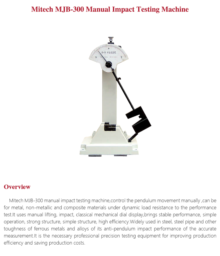 Product OverviewMitech MJB-300 manual impact testing machine,control the pendulum movement manually ,can be for metal, non-metallic and composite materials under dynamic load resistance to the performance test.It uses manual lifting, impact, classical mechanical dial display,brings stable performance, simple operation, strong structure, simple structure, high efficiency.Widely used in steel, steel pipe and other toughness of ferrous metals and alloys of its anti-pendulum impact performance of the accurate measurement.It is the necessary professional precision testing equipment for improving production efficiency and saving production costs.