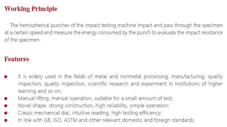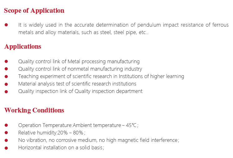 Function & applicationIt is widely used in the accurate determination of pendulum impact resistance of ferrous metals and alloy materials, such as steel, steel pipe, etc..