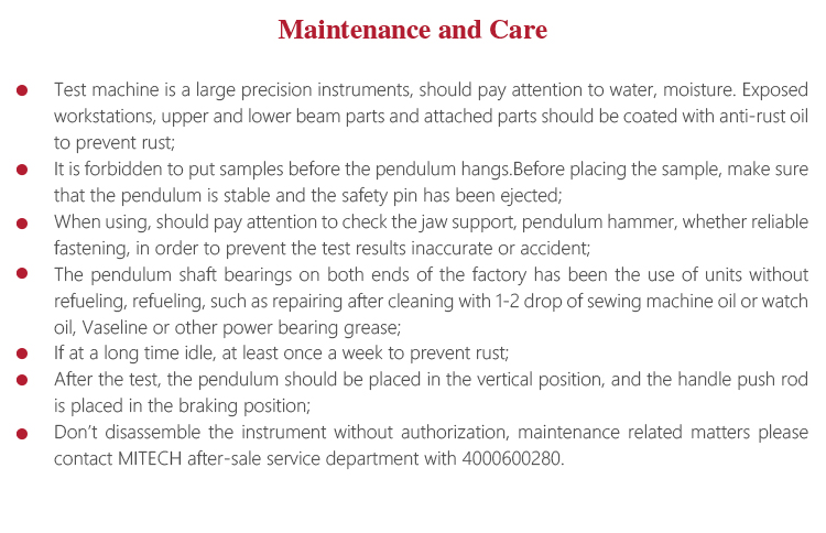 l After the test, the pendulum should be placed in the vertical position, and the handle push rod is placed in the braking