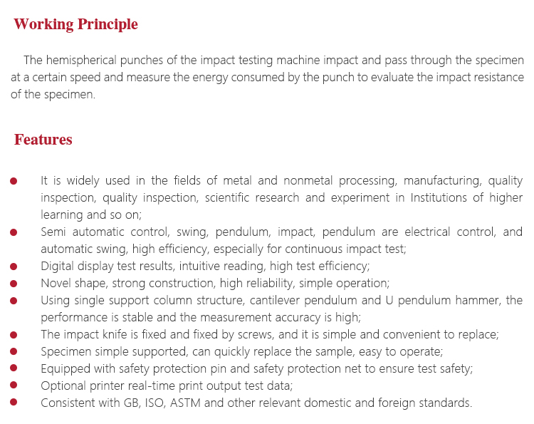 Function & applicationIt is widely used in the accurate determination of pendulum impact resistance of ferrous metals and alloy materials, such as steel, steel pipe, etc..