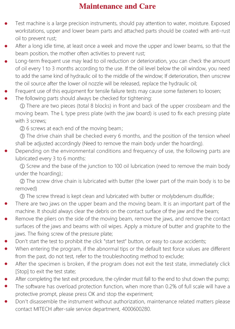 <!--[if !supportLists]-->l <!--[endif]-->Frequent use of this equipment for tensile failure test may cause some of the fasteners loose. The following parts should always be checked for tightening: