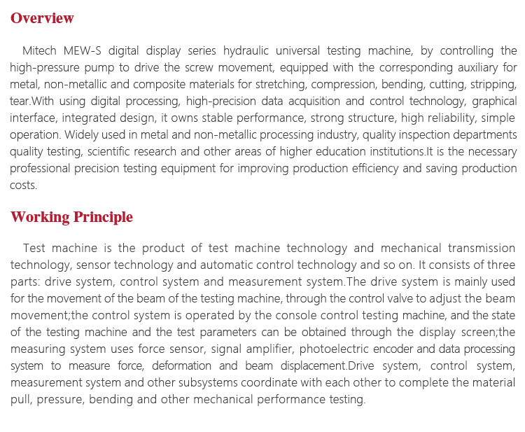 Mitech MEW-S digital display series hydraulic universal testing machine, by controlling the high-pressure pump to drive the screw movement, equipped with the corresponding auxiliary for metal, non-metallic and composite materials for stretching, compression, bending, cutting, stripping, tear.With using digital processing, high-precision data acquisition and control technology, graphical interface, integrated design, it owns stable performance, strong structure, high reliability, simple operation. Widely used in metal and non-metallic processing industry, quality inspection departments quality testing, scientific research and other areas of higher education institutions.It is the necessary professional precision testing equipment for improving production efficiency and saving production costs