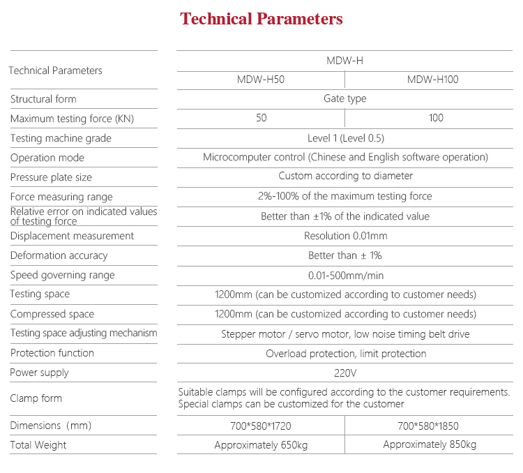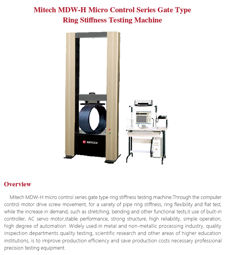 Mitech MDW-H micro control series gate type ring stiffness testing machine.Through the computer control motor drive screw movement, for a variety of pipe ring stiffness, ring flexibility and flat test, while the increase in demand, such as stretching, bending and other functional tests,it use of built-in controller, AC servo motor,stable performance, strong structure, high reliability, simple operation, high degree of automation. Widely used in metal and non-metallic processing industry, quality inspection departments quality testing, scientific research and other areas of higher education institutions, is to improve production efficiency and save production costs necessary professional precision testing equipment.