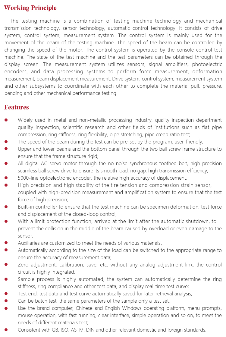 Function & applicationWidely used in metal, non-metallic and composite pipe flat compression, ring stiffness, ring flexibility, tensile, creep ratio test.