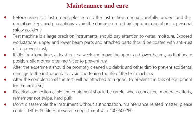 l Test machine is a large precision instruments, should pay attention to water, moisture. Exposed workstations, upper and lower beam parts and attached parts should be coated with anti-rust oil to prevent rust;