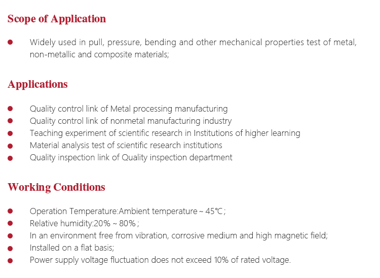 Working PrincipleThe testing machine is the product of combing the testing machine technology with the mechanical transmission technology, the sensor technology, the automation control technology and so on, which is composed of the drive system, the control system, the measurement system . The driving system is mainly used for the movement of the beam of the testing machine through the control valve. The control system regulate the testing machine by the console , getting the state of the test machine and the test parameters through the display screen. The measuring system can conduct the measurement of force , deformation and beam displacement using the sensor, signal amplifiers, photoelectric encoders and data processing systems. This machine can conduct the mechanical performance testing of the material pull, pressure, bending and so on through the coordination of the drive system, control system, measurement system and other subsystems .