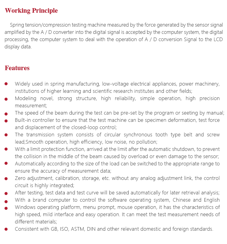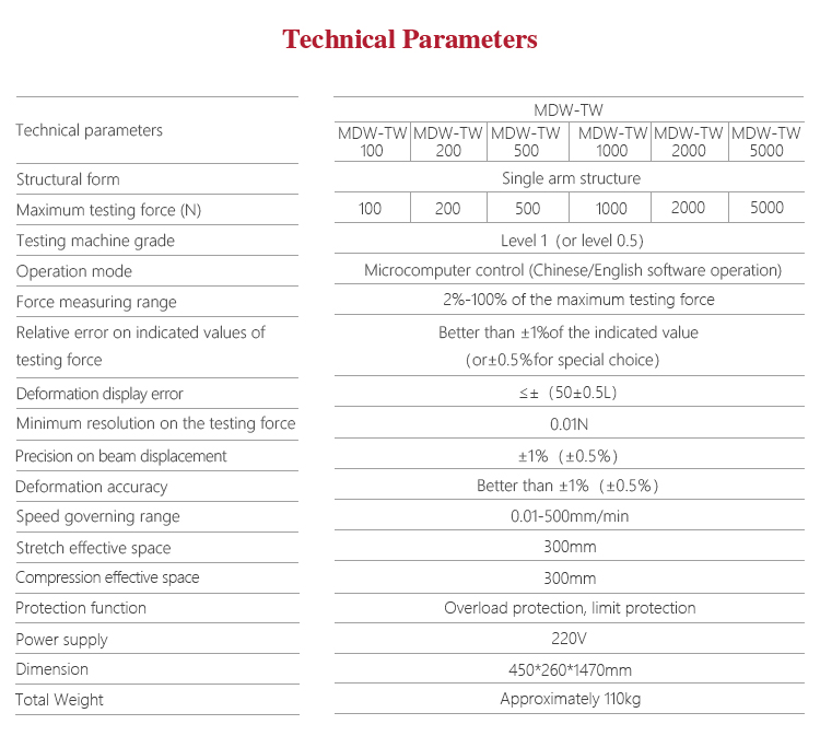 Mitech MDW-TW micro control series Single-arm Spring Tension/Compression Testing Machine, through the single-chip automatic control motor driving screw movement, for a variety of coil springs for tensile and compression test. It’s adopts the built-in controller, AC servo motor, by computer-aided means to achieve powerful function with stable performance, strong structure, high reliability, simple operation, high degree of automation. Widely used in spring manufacturing, low-voltage electrical appliances, power machinery, institutions of higher learning and scientific research institutes and other fields.It is the necessary professional precision testing equipment for improving production efficiency and saving production costs.