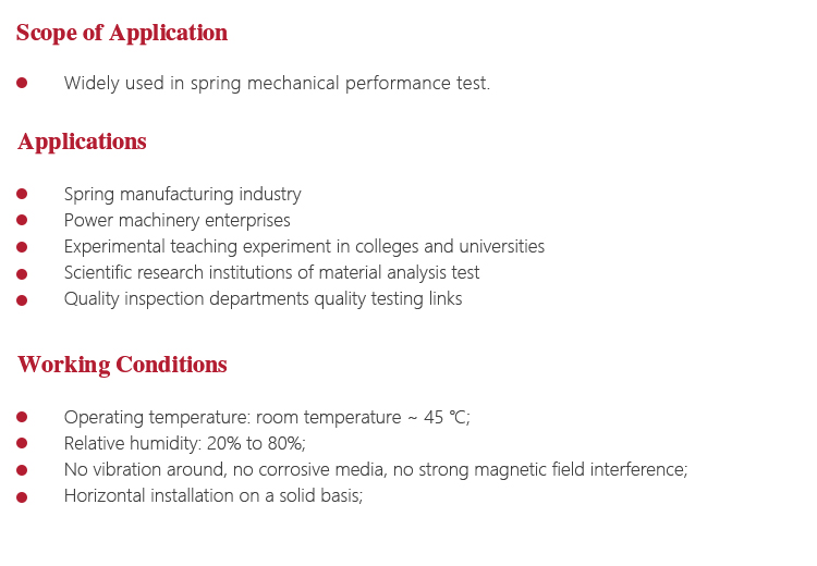 Mitech MDW-TW micro-control series gantry landing type spring tension and compression testing machine,by microcomputer control motor drive screw motion, for a wide variety of spring tension and compression experiment was carried out, it adopts the built-in controller, AC servo motor, stable performance, strong structure, high reliability, simple operation and high degree of automation. Computer-aided means to achieve powerful functionality. Widely used in spring manufacturing, low-voltage electrical appliances, power machinery, institutions of higher learning and scientific research units and other fields.It is the necessary professional precision testing equipment for improving production efficiency and saving production costs.