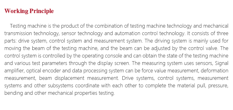 Testing machine is the product of the combination of testing machine technology and mechanical transmission technology, sensor technology and automation control technology. It consists of three parts: drive system, control system and measurement system. The driving system is mainly used for moving the beam of the testing machine, and the beam can be adjusted by the control valve. The control system is controlled by the operating console and can obtain the state of the testing machine and various test parameters through the display screen. The measuring system uses sensors, Signal amplifier, optical encoder and data processing system can be force value measurement, deformation measurement, beam displacement measurement. Drive systems, control systems, measurement systems and other subsystems coordinate with each other to complete the material pull, pressure, bending and other mechanical properties testing.
