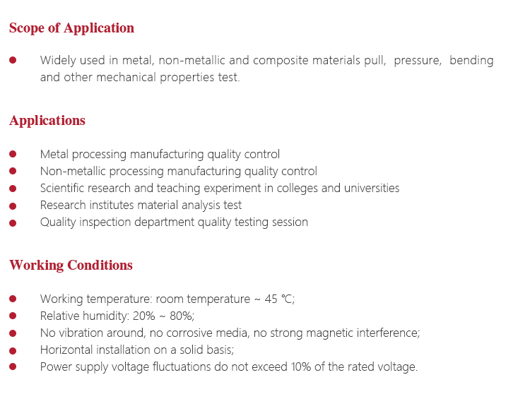 l Test machine is a large precision instruments, should pay attention to water, moisture. Exposed outside the workbench, the upper and lower beams and accessories should be coated with anti-rust oil to prevent rust;