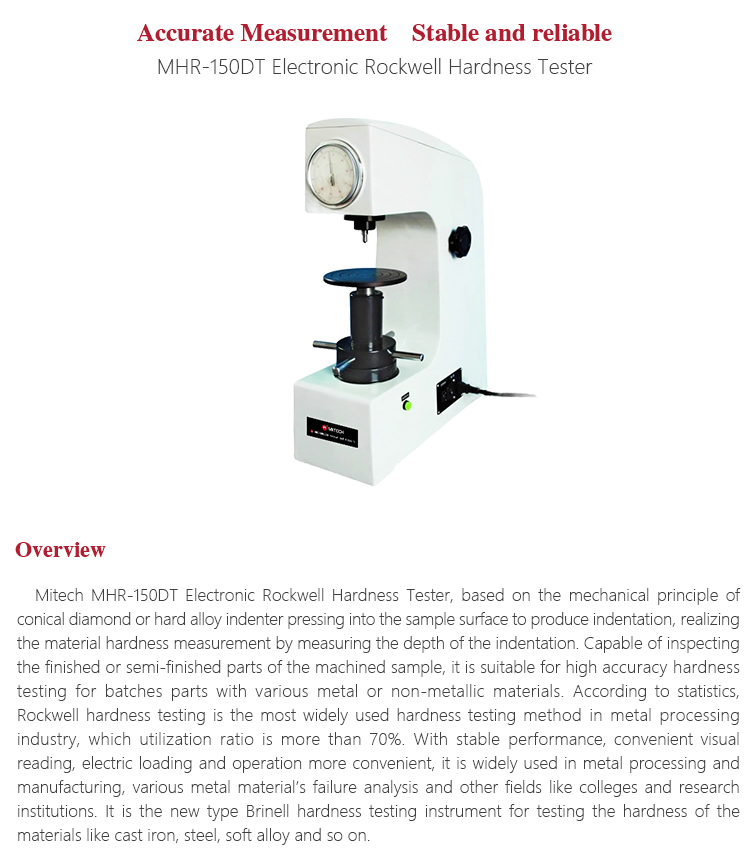 Product OverviewMitech MHR-150DT Electronic Rockwell Hardness Tester, based on the mechanical principle of conical diamond or hard alloy indenter pressing into the sample surface to produce indentation, realizing the material hardness measurement by measuring the depth of the indentation. Capable of inspecting the finished or semi-finished parts of the machined sample, it is suitable for high accuracy hardness testing for batches parts with various metal or non-metallic materials. According to statistics, Rockwell hardness testing is the most widely used hardness testing method in metal processing industry, which utilization ratio is more than 70%. With stable performance, convenient visual reading, electric loading and operation more convenient, it is widely used in metal processing and manufacturing, various metal material’s failure analysis and other fields like colleges and research institutions. It is the new type Brinell hardness testing instrument for testing the hardness of the materials like cast iron, steel, soft alloy and so on.