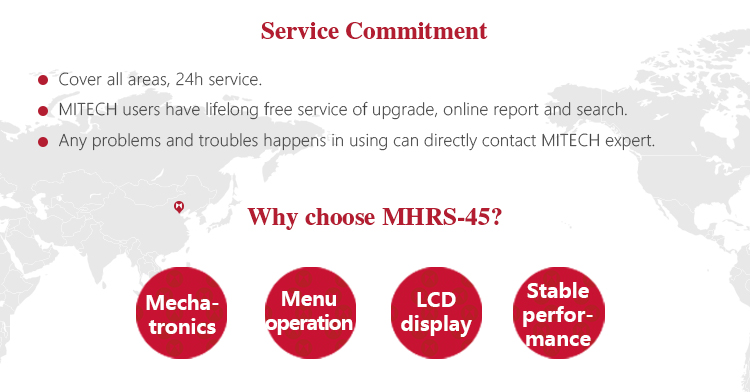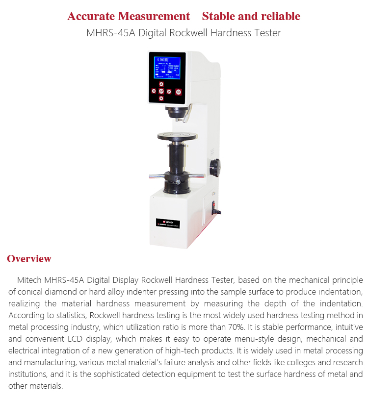 Mitech MHRS-45A Digital Display Rockwell Hardness Tester, based on the mechanical principle of conical diamond or hard alloy indenter pressing into the sample surface to produce indentation, realizing the material hardness measurement by measuring the depth of the indentation. According to statistics, Rockwell hardness testing is the most widely used hardness testing method in metal processing industry, which utilization ratio is more than 70%. It is stable performance, intuitive and convenient LCD display, which makes it easy to operate menu-style design, mechanical and electrical integration of a new generation of high-tech products. It is widely used in metal processing and manufacturing, various metal material’s failure analysis and other fields like colleges and research institutions, and it is the sophisticated detection equipment to test the surface hardness of metal and other materials.