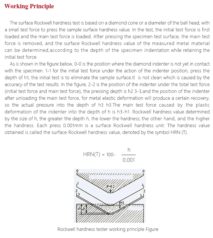 As is shown in the figure below, 0-0 is the position where the diamond indenter is not yet in contact with the specimen. 1-1 for the initial test force under the action of the indenter position, press the depth of h1, the initial test is to eliminate the sample surface.It  is not clean which is caused by the accuracy of the test results. In the figure, 2-2 is the position of the indenter under the total test force (initial test force and main test force), the pressing depth is h2.3-3,and the position of the indenter after unloading the main test force, for metal elastic deformation will produce a certain recovery, so the actual pressure into the depth of h3 h3.The main test force caused by the plastic deformation of the indenter into the depth of h is h3-h1. Rockwell hardness value determined by the size of h, the greater the depth h, the lower the hardness; the other hand, and the higher the hardness. Each press 0.001mm is a surface Rockwell hardness unit. The hardness value obtained is called the surface Rockwell hardness value, denoted by the symbol HRN (T).
