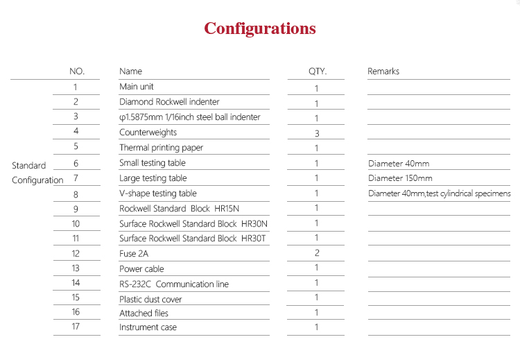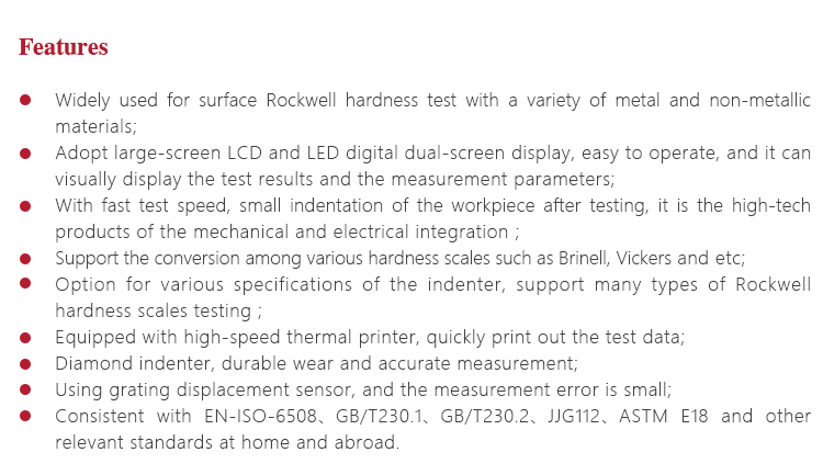 l Option for various specifications of the indenter, support many types of Rockwell hardness scales testing ;