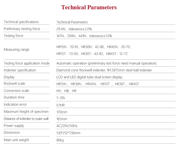 Indentor specification Diamond cone Rockwell indenter, Φ1.5875mm steel ball indenter.