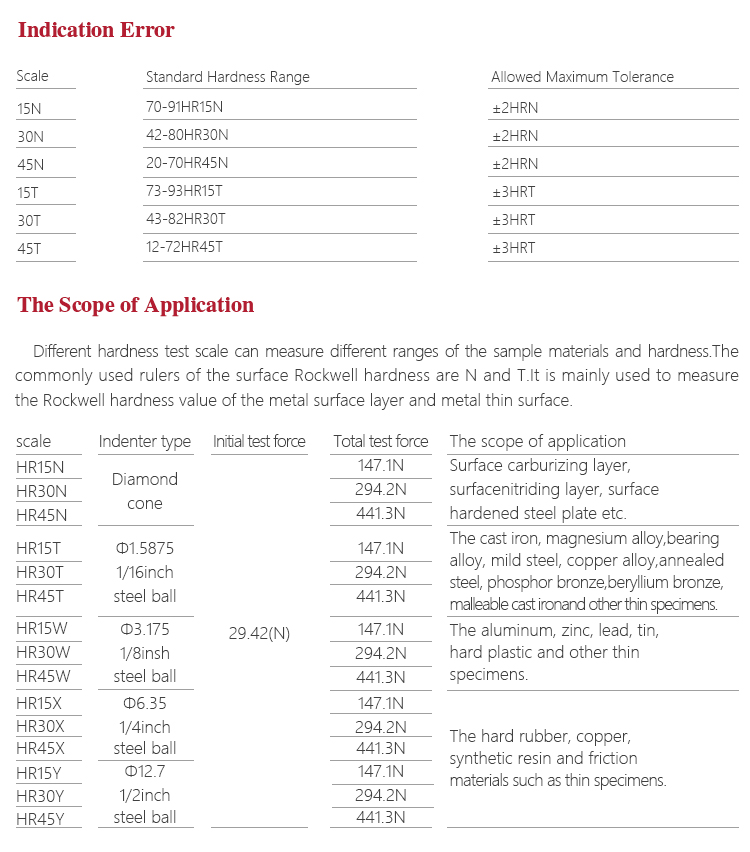 Measuring range HR15N:70-91、HR30N:42-80、HR45N:20-70、 HR15T:73-93、HR30T:43-82、HR45T:12-72