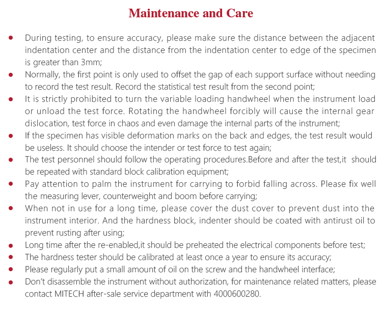 l The hardness tester should be calibrated at least once a year to ensure its accuracy;