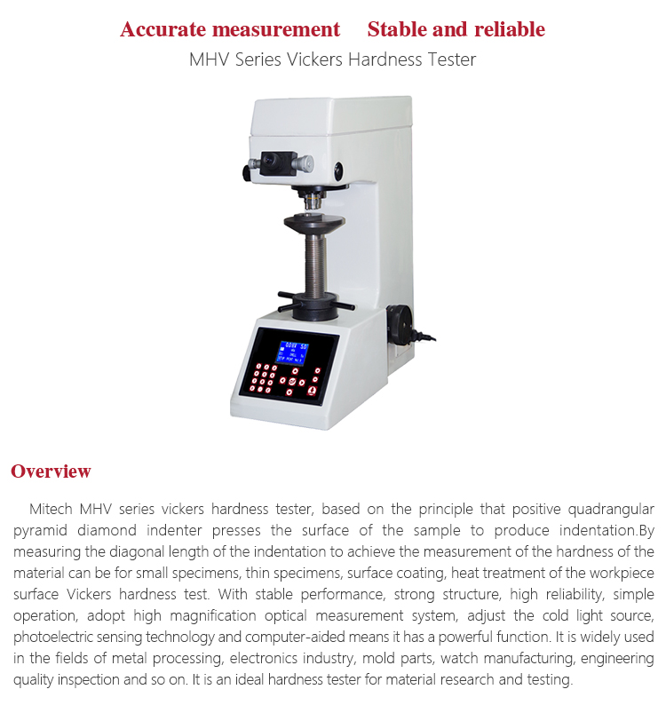 Mitech MHV series vickers hardness tester, based on the principle that positive quadrangular pyramid diamond indenter presses the surface of the sample to produce indentation.By measuring the diagonal length of the indentation to achieve the measurement of the hardness of the material can be for small specimens, thin specimens, surface coating, heat treatment of the workpiece surface Vickers hardness test. With stable performance, strong structure, high reliability, simple operation, adopt high magnification optical measurement system, adjust the cold light source, photoelectric sensing technology and computer-aided means it has a powerful function. It is widely used in the fields of metal processing, electronics industry, mold parts, watch manufacturing, engineering quality inspection and so on. It is an ideal hardness tester for material research and testing.