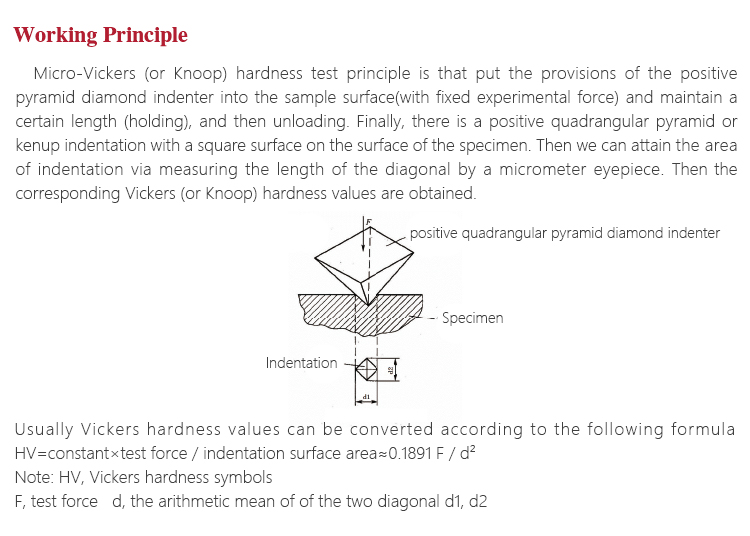 Micro-Vickers (or Knoop) hardness test principle is that put the provisions of the positive pyramid diamond indenter into the sample surface(with fixed experimental force) and maintain a certain length (holding), and then unloading. Finally, there is a positive quadrangular pyramid or kenup indentation with a square surface on the surface of the specimen. Then we can attain the area of indentation via measuring the length of the diagonal by a micrometer eyepiece. Then the corresponding Vickers (or Knoop) hardness values are obtaine.