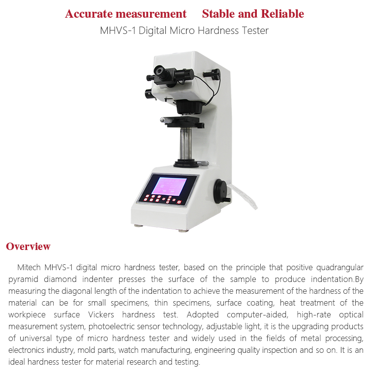 Mitech MHVS-1digital micro hardness tester, based on the principle that positive quadrangular pyramid diamond indenter presses the surface of the sample to produce indentation.By measuring the diagonal length of the indentation to achieve the measurement of the hardness of the material can be for small specimens, thin specimens, surface coating, heat treatment of the workpiece surface Vickers hardness test. Adopted computer-aided, high-rate optical measurement system, photoelectric sensor technology, adjustable light, it is the upgrading products of universal type of micro hardness tester and widely used in the fields of metal processing, electronics industry, mold parts, watch manufacturing, engineering quality inspection and so on. It is an ideal hardness tester for material research and testing.