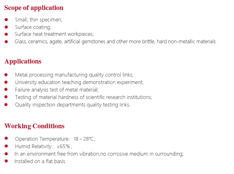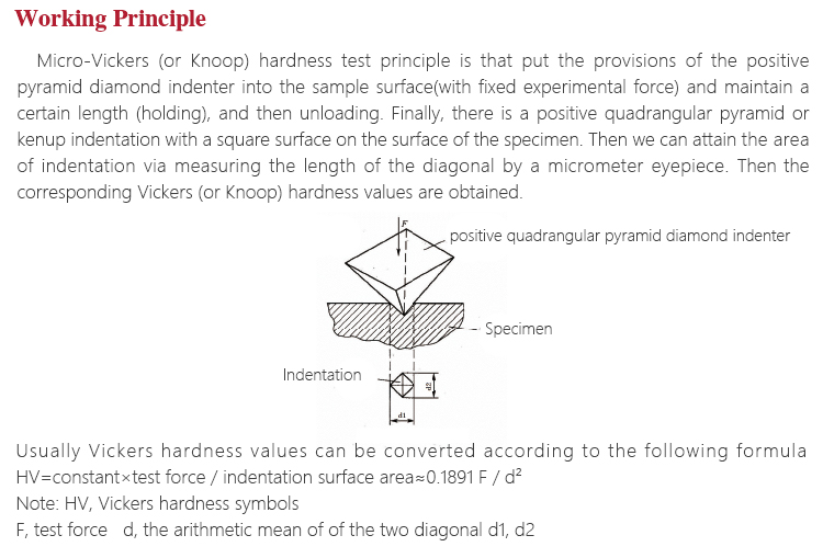 Micro-Vickers (or Knoop) hardness test principle is that put the provisions of the positive pyramid diamond indenter into the sample surface(with fixed experimental force) and maintain a certain length (holding), and then unloading. Finally, there is a positive quadrangular pyramid or kenup indentation with a square surface on the surface of the specimen. Then we can attain the area of indentation via measuring the length of the diagonal by a micrometer eyepiece. Then the corresponding Vickers (or Knoop) hardness values are obtained.