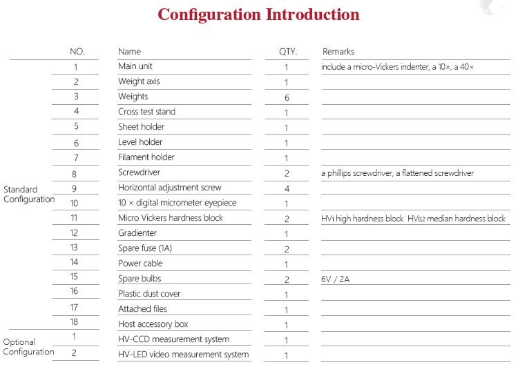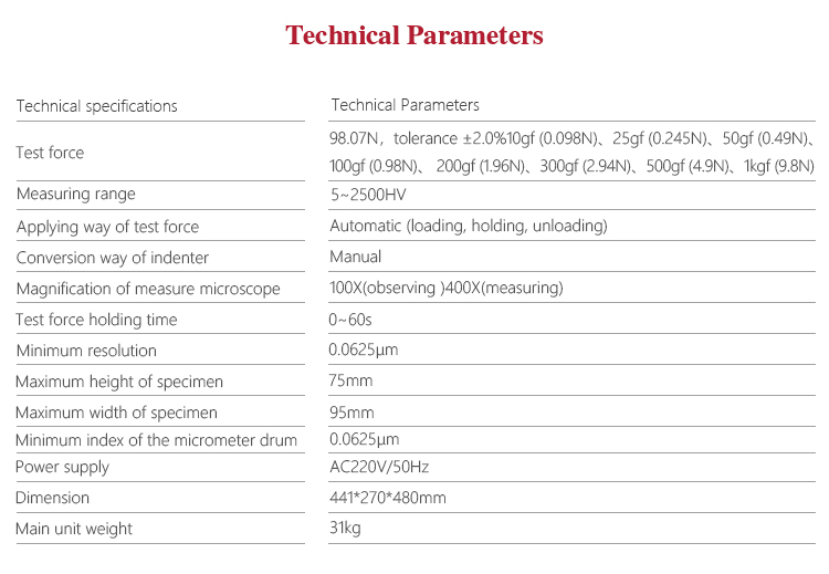 • Test force 98.07N,tolerance ±2.0%10gf (0.098N)、25gf (0.245N)、50gf (0.49N)、100gf (0.98N)、 200gf (1.96N)、300gf (
