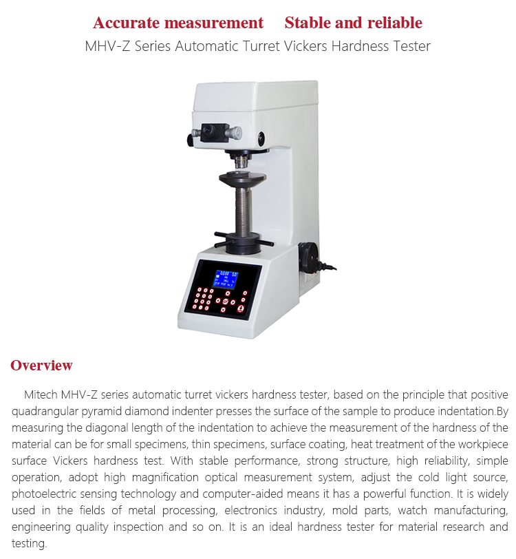 Mitech MHV-Z series automatic turret vickers hardness tester, based on the principle that positive quadrangular pyramid diamond indenter presses the surface of the sample to produce indentation.By measuring the diagonal length of the indentation to achieve the measurement of the hardness of the material can be for small specimens, thin specimens, surface coating, heat treatment of the workpiece surface Vickers hardness test. With stable performance, strong structure, high reliability, simple operation, adopt high magnification optical measurement system, adjust the cold light source, photoelectric sensing technology and computer-aided means it has a powerful function. It is widely used in the fields of metal processing, electronics industry, mold parts, watch manufacturing, engineering quality inspection and so on. It is an ideal hardness tester for material research and testing.