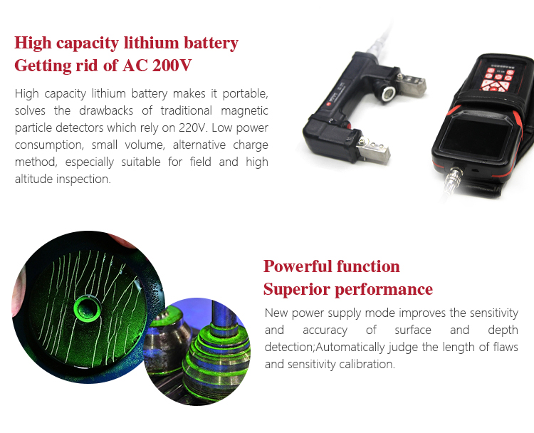 l The large capacity lithium battery makes it portable, solves the drawbacks of traditional, magnetic particle detector relying on the 220V power supply, with low power consumption, small size, battery can be charged when the detector is on and off. It is especially suitable for testing in field or high altitude;