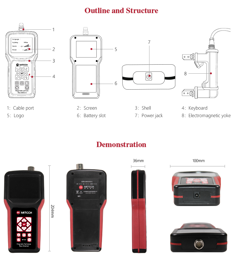 MITECH Portable Magnetic Flaw Detector Electromagnetic Yoke,Size: 174mm * 162mm * 38mm, Electromagnetic yoke distance: 75-200mm, Electromagnetic yoke Weight: 1.5kg.The use of pulsating power supply technology, continuous uninterrupted work, from the traditional electromagnetic yoke must be the gap time limit. At the same time lighting brightness, power, yoke spacing adjustable to meet your needs of different measurement conditions.