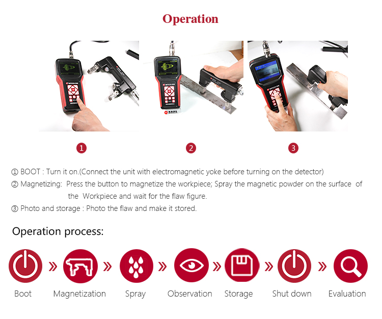 Put the workpiece into high-intensity magnetic field, connect electric to make it magnetized, if there are flaws (crack,slag) in or near the surface, there will be a leakage around the flaws. Put good quality magnetic powder(usually the magnetic iron oxide powder)on the object, magnetic powder will gather together near the leaked magnetic field, piled up to form visible traces of magnetic powder. In the proper light, we can see the marks and judge the position, size, shape and degree of the flaws.