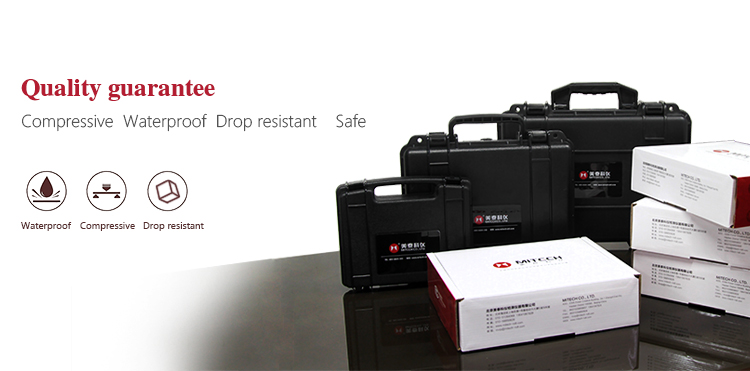MITECH portable Leeb hardness tester box, length: 35.5cm; width: 19cm; high: 11cm; weight: 1.5kg. It is made of ABS plastic, which is waterproof and resistant to shock. It has excellent heat resistance, low temperature resistance and so on. It can effectively protect the oil, dust and various kinds of corrosion in harsh environment. The box size is in line with aviation, (Can be placed under the seat and luggage rack), safe, reliable and stable.