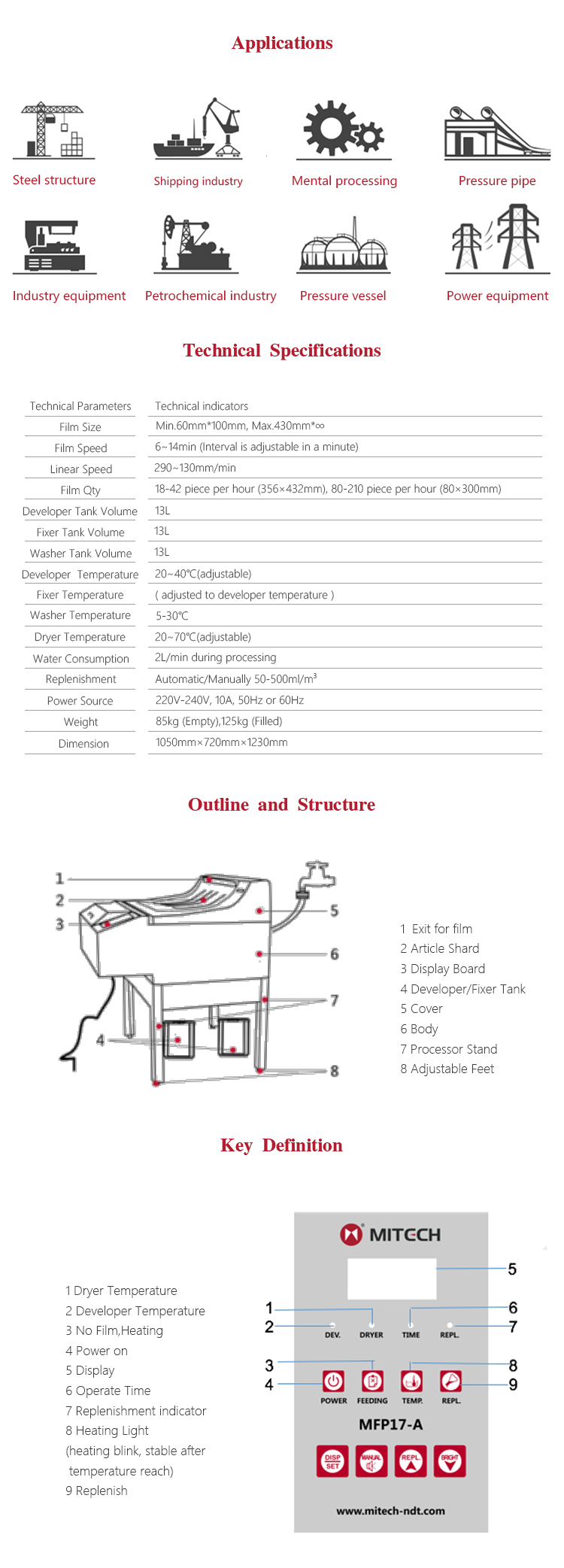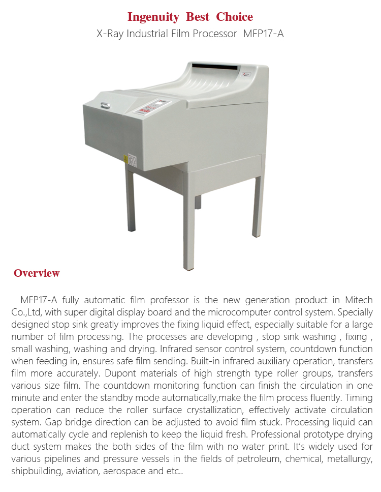 MFP17-A fully automatic film professor is the new generation product in Mitech Co.,Ltd, with super digital display board and the microcomputer control system. Specially designed stop sink greatly improves the fixing liquid effect, especially suitable for a large number of film processing. Processing liquid can automatically cycle and replenish to keep the liquid fresh. Professional prototype drying duct system makes the both sides of the film with no water print. It’s widely used for various pipelines and pressure vessels in the fields of petroleum, chemical, metallurgy, shipbuilding, aviation, aerospace and etc.