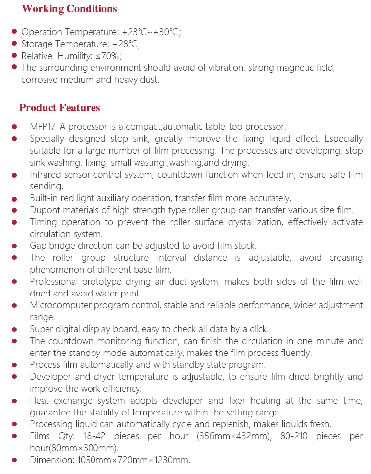 The four processes have high requirements for the temperature, time and liquid concentrations in developer and fixer. Film process has four modes, cold, preheating, wash and self-inspection. Under cold mode, system is on electricity but not work. Under preheating mode, working area starts to heat to certain temperature without film. When the film enters in, temperature goes up rapidly to wash film. Wash mode means film is under washing. Under self-inspection, it can check whether each component is working normally.