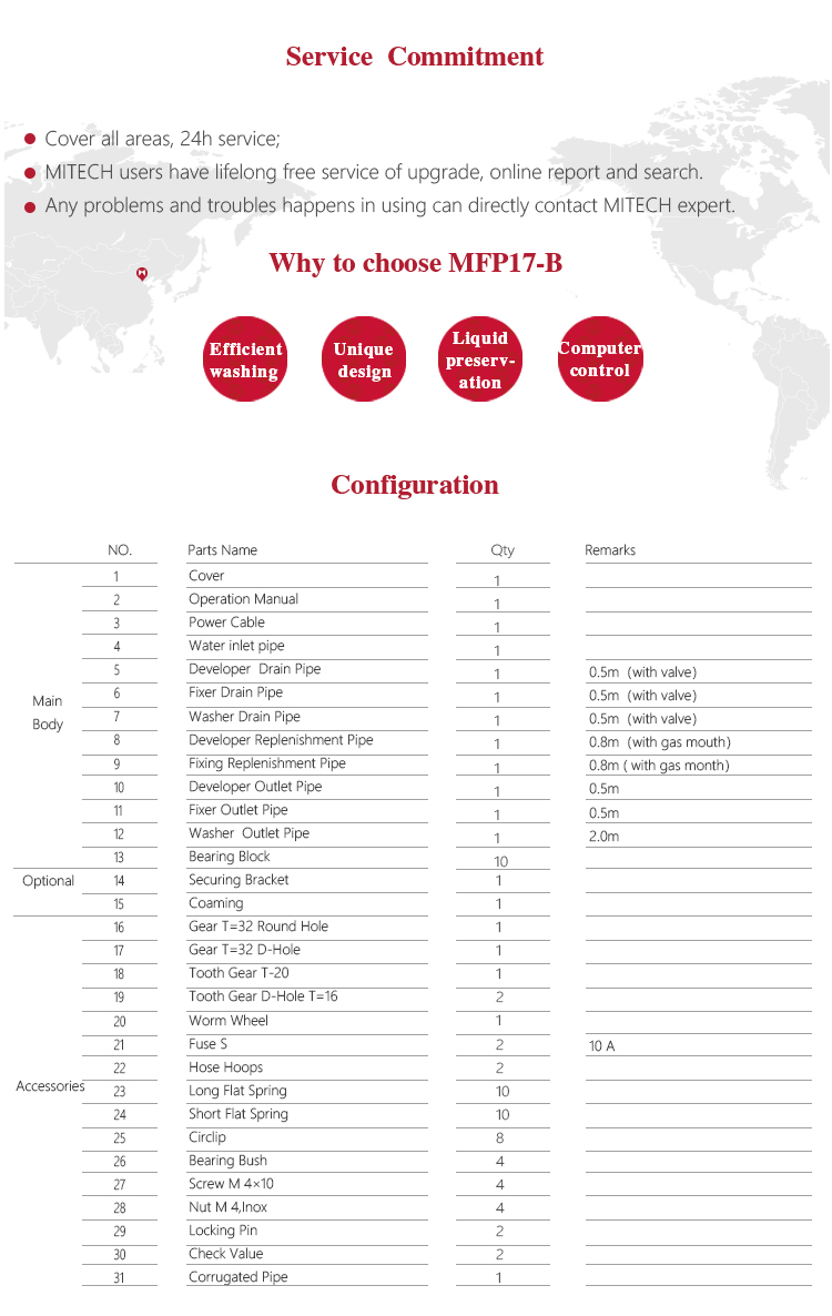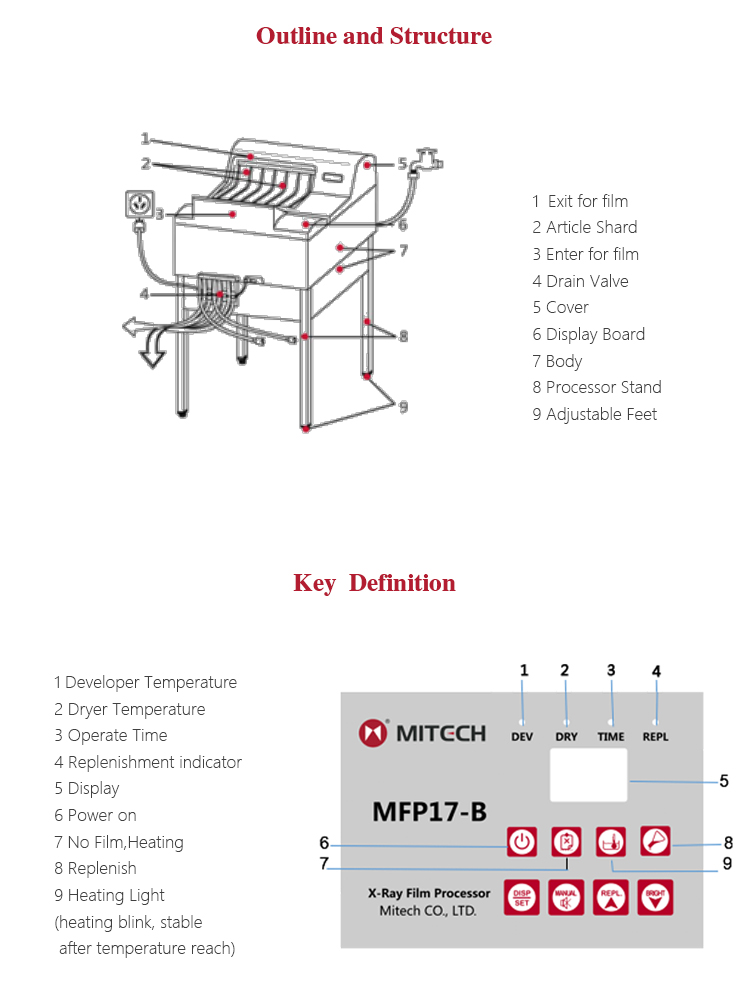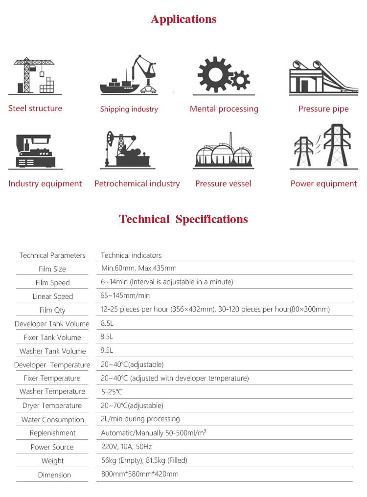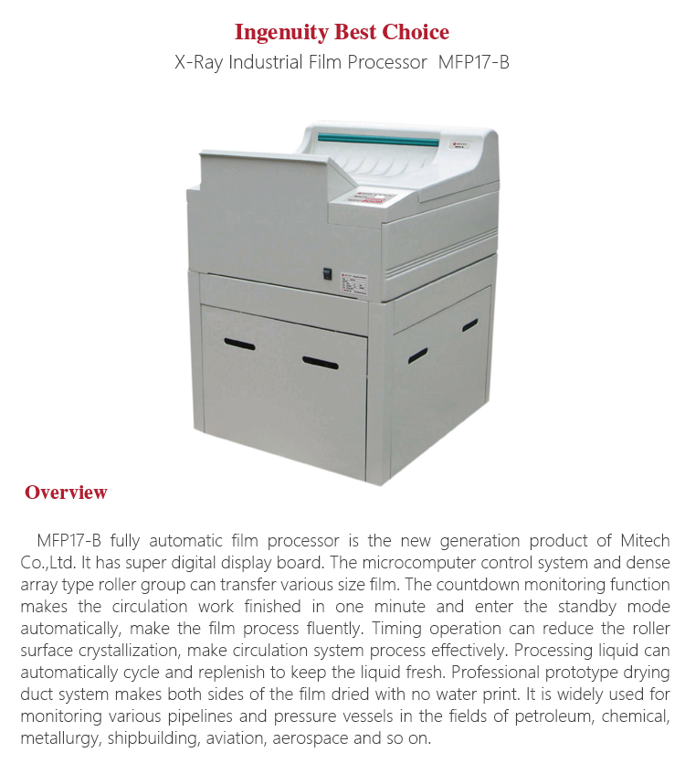 MFP17-B fully automatic film processor is the new generation product of Mitech Co.,Ltd. It has super digital display board, the microcomputer control system and dense array type roller group can transfer various size film. The countdown monitoring function makes the circulation work finished in one minute and enter the standby mode automatically. Processing liquid can automatically cycle and replenish to keep the liquid fresh. Professional prototype drying duct system makes both sides of the film dried with no water print. It is widely used for monitoring various pipelines and pressure vessels in the fields of petroleum, chemical, metallurgy, shipbuilding, aviation, aerospace and so on.