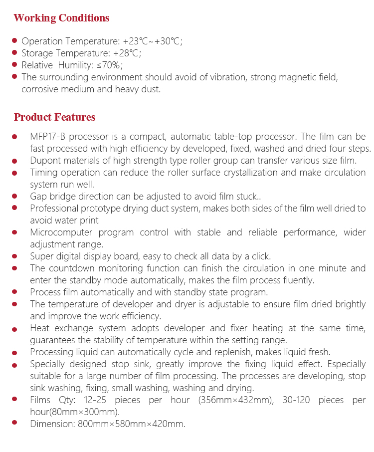 The four processes have high requirements for the temperature, time and liquid concentrations in developer and fixer. Film process has four modes, cold, preheating, wash, and self-inspection. Under cold mode, system is on electricity but not work. Under preheating mode ,working area starts to heat to certain temperature without film. When the film enters in, temperature goes up rapidly to wash film. Wash mode means film is under washing. Under self-inspection, it can check whether each component is working normally.