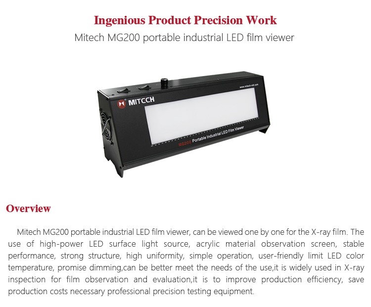 Mitech MG200 portable industrial LED film viewer, can be viewed one by one for the X-ray film. The use of high-power LED surface light source, acrylic material observation screen, stable performance, strong structure, high uniformity, simple operation, user-friendly limit LED color temperature, promise dimming,can be better meet the needs of the use,it is widely used in X-ray inspection for film observation and evaluation,it is to improve production efficiency, save production costs necessary professional precision testing equipment