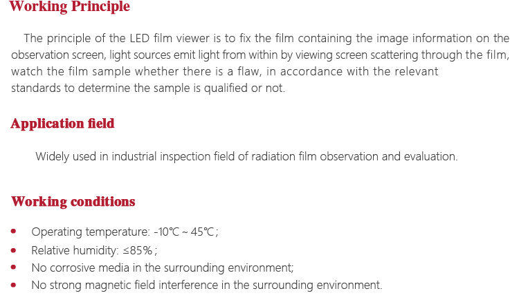 The principle of the LED film viewer is to fix the film containing the image information on the observation screen, light sources emit light from within by viewing screen scattering through the film, watch the film sample whether there is a flaw, in accordance with the relevant standards to determine the sample is qualified or not