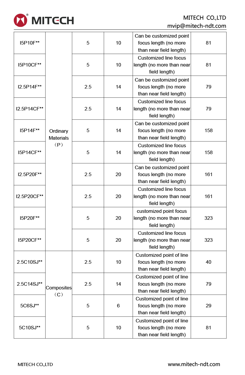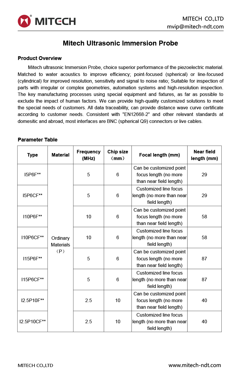Mitech ultrasonic Immersion Probe, choice superior performance of the piezoelectric material. Matched to water acoustics to improve efficiency; point-focused (spherical) or line-focused (cylindrical) for improved resolution, sensitivity and signal to noise ratio; Suitable for inspection of parts with irregular or complex geometries, automation systems and high-resolution inspection. The key manufacturing processes using special equipment and fixtures, as far as possible to exclude the impact of human factors. We can provide high-quality customized solutions to meet the special needs of customers. All data traceability, can provide distance wave curve certificate according to customer needs. Consistent with "EN12668-2" and other relevant standards at domesitic and abroad, most interfaces are BNC (spherical Q9) connectors or live cables.