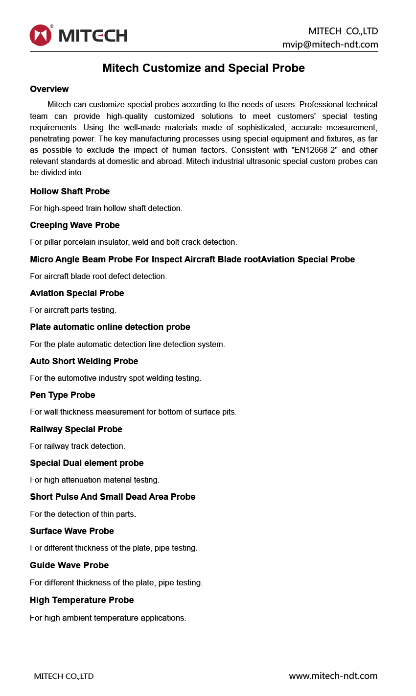 Mitech can customize special probes according to the needs of users. Professional technical team can provide high-quality customized solutions to meet customers' special testing requirements. Using the well-made materials made of sophisticated, accurate measurement, penetrating power. The key manufacturing processes using special equipment and fixtures, as far as possible to exclude the impact of human factors. Consistent with "EN12668-2" and other relevant standards at domestic and abroad.