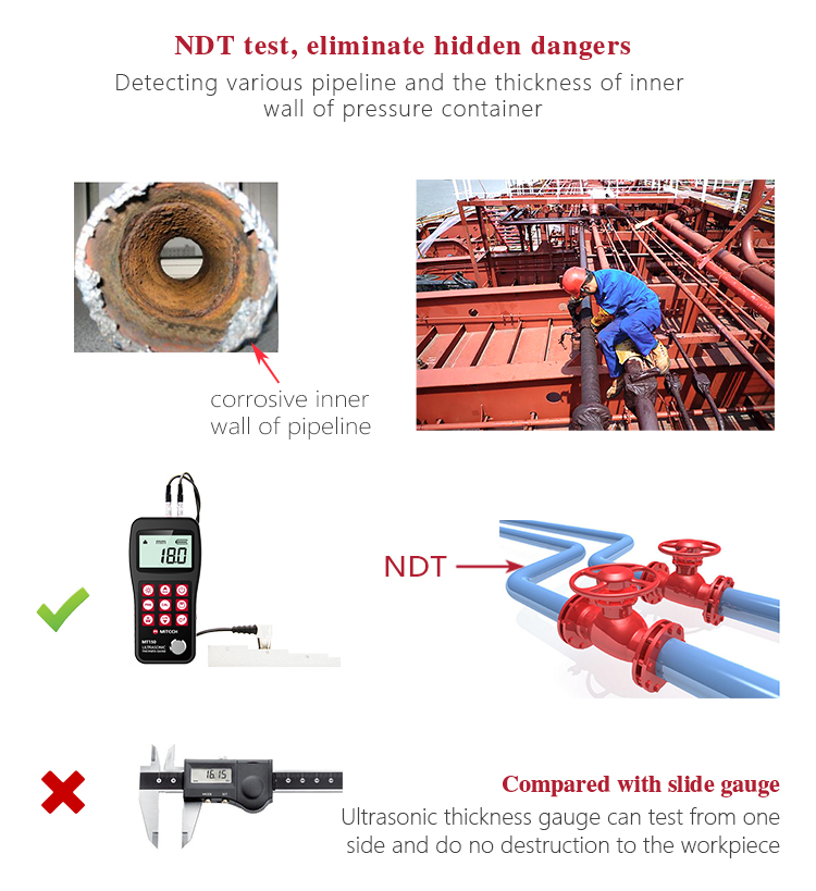 Product OverviewThe model MT150 is a digital ultrasonic thickness gauge. Based on the principle of ultrasonic principle, the instrument is capable of measuring the thickness of various materials, such as metal, plastic, ceramic, glass and many other good ultrasonic conductors. It of all kinds of materials. Compared with the traditional measurement methods, the advantages of ultrasonic thickness gauge is exposed to one side of the workpiece to complete the measurement. Its unique non-destructive testing performance provide the perfect solution for the thickness testing of closed pipes, containers, etc. It is widely used in pertroleum , chemical ,metallurgy, shipbuilding, aviation, aerospace and other fields because of monitoring corrosion thinning degree of various pipes and pressure vessels. It can also be used for precise measurement of sheet metal and machined parts.